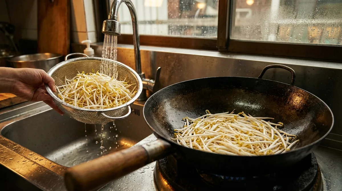 콩나물은 흐르는 물에 깨끗이 씻어 채반에 받쳐 물기를 털어냅니다. 넓은 웍이나 냄비에 씻은 콩나물을 평평하게 깔아주세요.
